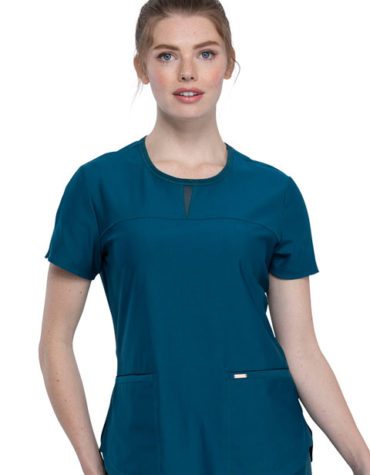 This Contemporary fit V-neck full zip top has a knit inset double neckline. Other features include knit front and back panels, two angled front pockets plus a shirttail hem. Center back length: 26″ Fabric content: 76% Polyester / 19% Rayon / 5% Spandex Linear Texture Dobby